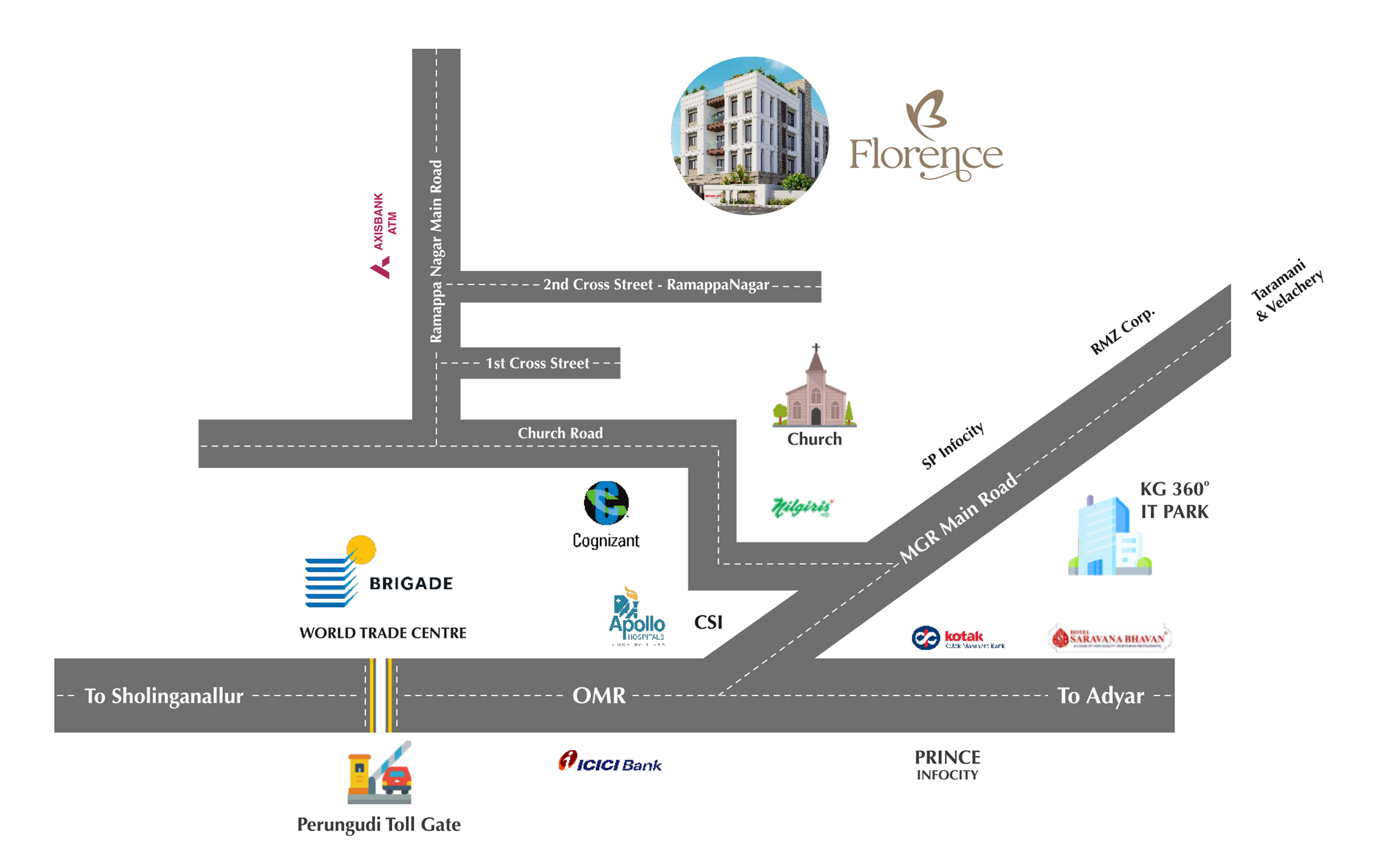 A house is more than just a concrete structure. It is a way of life. a home is where you experience it. We at Kirthika are proud to present our next landmark project the "Florence". It's not just a condominium, but a piece of art. Experience life as we transport you to a period of renaissance. As Kirthika has maintained its reputation as one of the city's premium apartment builders. This project offers the best of both worlds one of a kind blend of modern and Italian classical architecture and grand lobby designs. The "Florence" has a lot to offer to its residents. It is well located in the posh and tranquil part of Perungudi just a few hundred metres away from the bustling IT parks of OMR and with close proximity to some of the best schools and lifestyle entertain areas of Chennai.